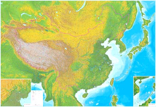 面积960万平方千米,是亚洲领土面积最大的国家,在世界众多国家中,仅次于俄罗斯和加拿大,居世界第三。 中国领土北起漠河以北的黑龙江江心,南到南沙群岛的曾母暗沙,南北相距5500公里;东起黑龙江与 乌苏里江的汇合处。西到帕米尔高原,东西相距5200公里。陆地边界长约2.28万公里。中国大陆的东部和南部 濒临渤海、黄海、东海和南海。海域面积约473万平方公里。岛屿5400个,岛屿总面积为3.87万平方公里。中国海岸线总长度3.2万公里,其中大陆海岸线1.8万公里,岛屿海岸线 1.4万公里。 中国地势西高东低呈阶梯状逐级下降。最高一级阶梯为青藏高原,平均海拔4000米以上,号称“世界屋脊”。 第二级阶梯由内蒙古高原、黄土高原、云贵高原和塔里木盆地、准葛尔盆地、四川盆地构成,平均海拔1000米 至2000米。从大兴安岭、太行山、巫山和雪峰山麓向东到海岸线,地势下降到海拔500至1000米为第三级阶梯。 第四级阶梯为中国大陆架浅海区,水深平均不到200米。全国各类地形的百分比为:山地占33%,高原占26%, 丘陵占10%,盆地占19%,平原占12%。